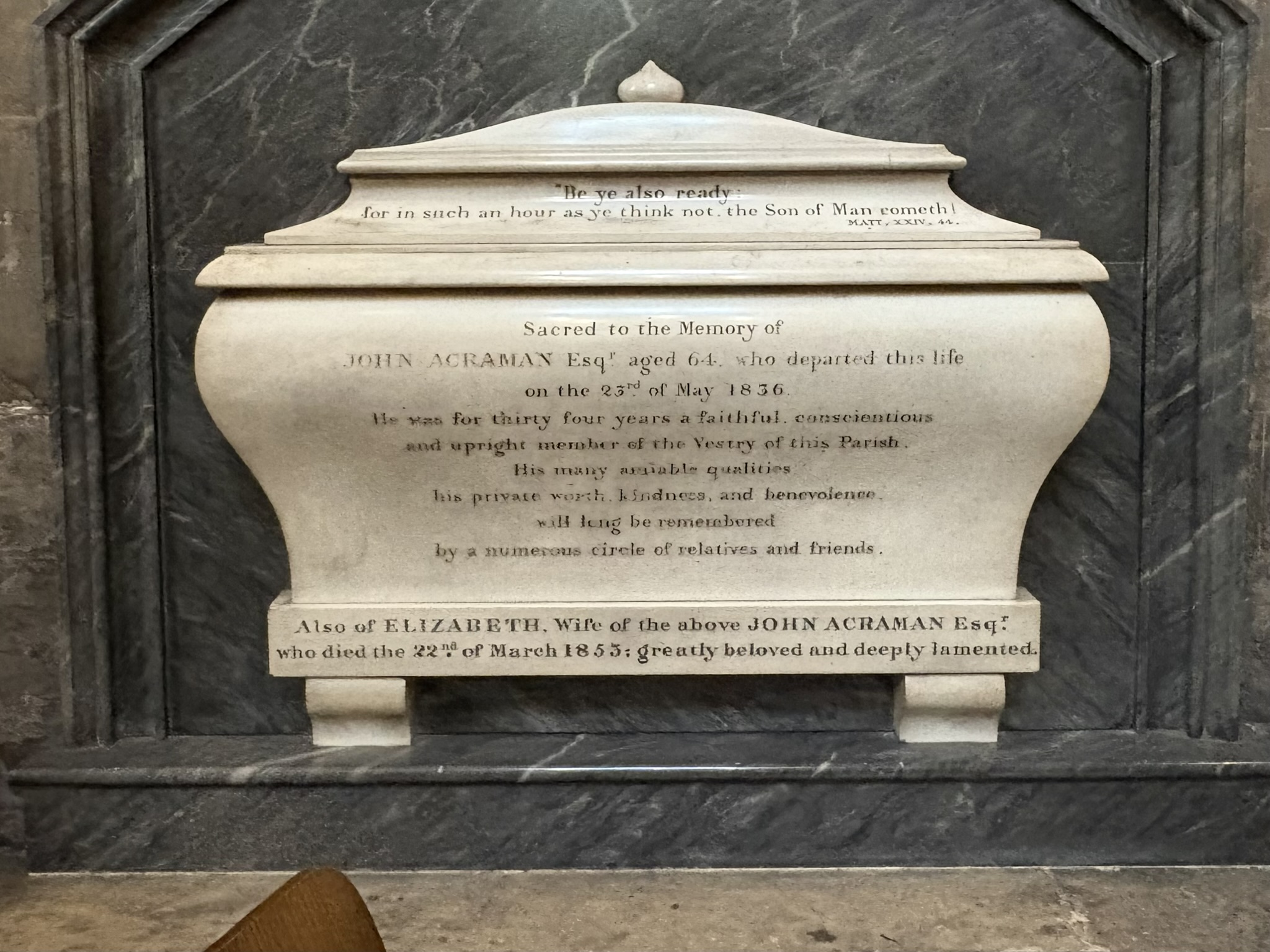 Acraman, John Church: St. Mary Redcliffe - Bristol (in Bristol, Somerset).Sex: Male.Virtue(s): Amiability*, Benevolence*, Conscientiousness*, Fidelity*, Kindness, Uprightness, Worth*.Literature: Biblical citation.Language: Only English.Year of death: 1836.Age at death: 64 (classed as: Adult).Looks like JavaScript is disabled; enable to get an interactive map of UK grave monuments.