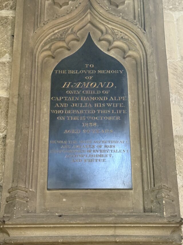 Alpe, Hamond Church: Norwich Cathedral (in Norwich, Norfolk).Relation: Child.Sex: Male.Virtue(s): Accomplishment*, Affection, Amiability*, Talent*, Virtues in general*.Language: Only English.Year of death: 1838.Age at death: 20 (classed as: Youth).Looks like JavaScript is disabled; enable to get an interactive map of UK grave monuments.