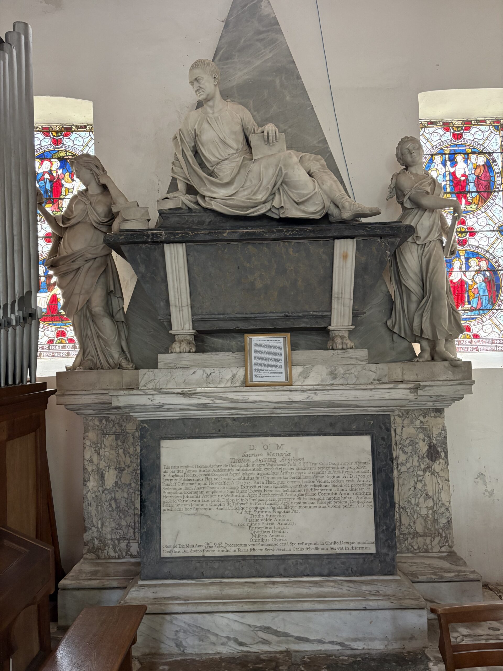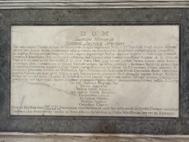 In Latin: "Sacred to the memory of Thomas Archer esquire youngest son of Thomas Archer of Umberslade in the county of Warwick, esquire, late Scholar of Trinity College, Oxford, where for three years of academical studies, and afterwards in four years of travel, he advanced and completed his education. Having returned to England fully adorned with a striking figure, handsome body and with noble limbs, he shone forth at Court, the most beautiful ornament and glory of youth. He was made Groom Porter to Her Majesty Queen Anne 1703 and Praefect of Customs at Newcastle A.D. 1715. In that year he bought this estate that you see here, reader, and entirely re-built that pleasant country house and made durable this Church, which was nearly ready to fall from age, and added to the adornment at his own expense. He married two wives, excellent women. First Eleanor, only daughter and heiress of John Archer of Welford in the County of Berkshire, esquire, who before she had completed the first year of her married life was taken by the Scourge of Smallpox almost in childbirth.