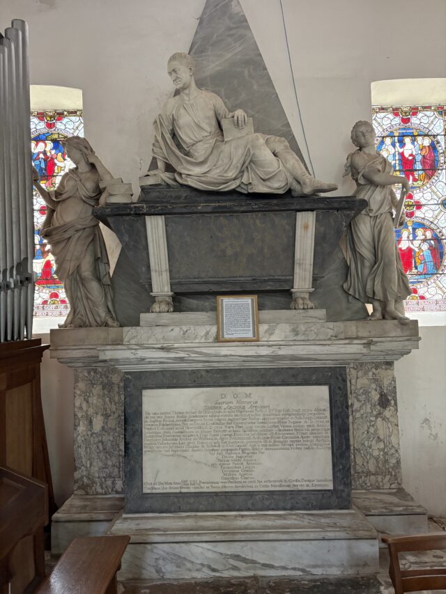 In his second marriage he wedded Anne, only daughter of John Chaplin of Tathwell, Lincoln, esquire from whom he had no issue, that supreme delight to much loved wives, and pledge of conjugal fidelity, and placed his lifetime this monument to himself. He was a man equal to the highest office, superior to titles, loving his country thoroughly, still more beloved by his country. Generous to the poor, a favourite with the rich, a friend to the wretched, beloved by all.