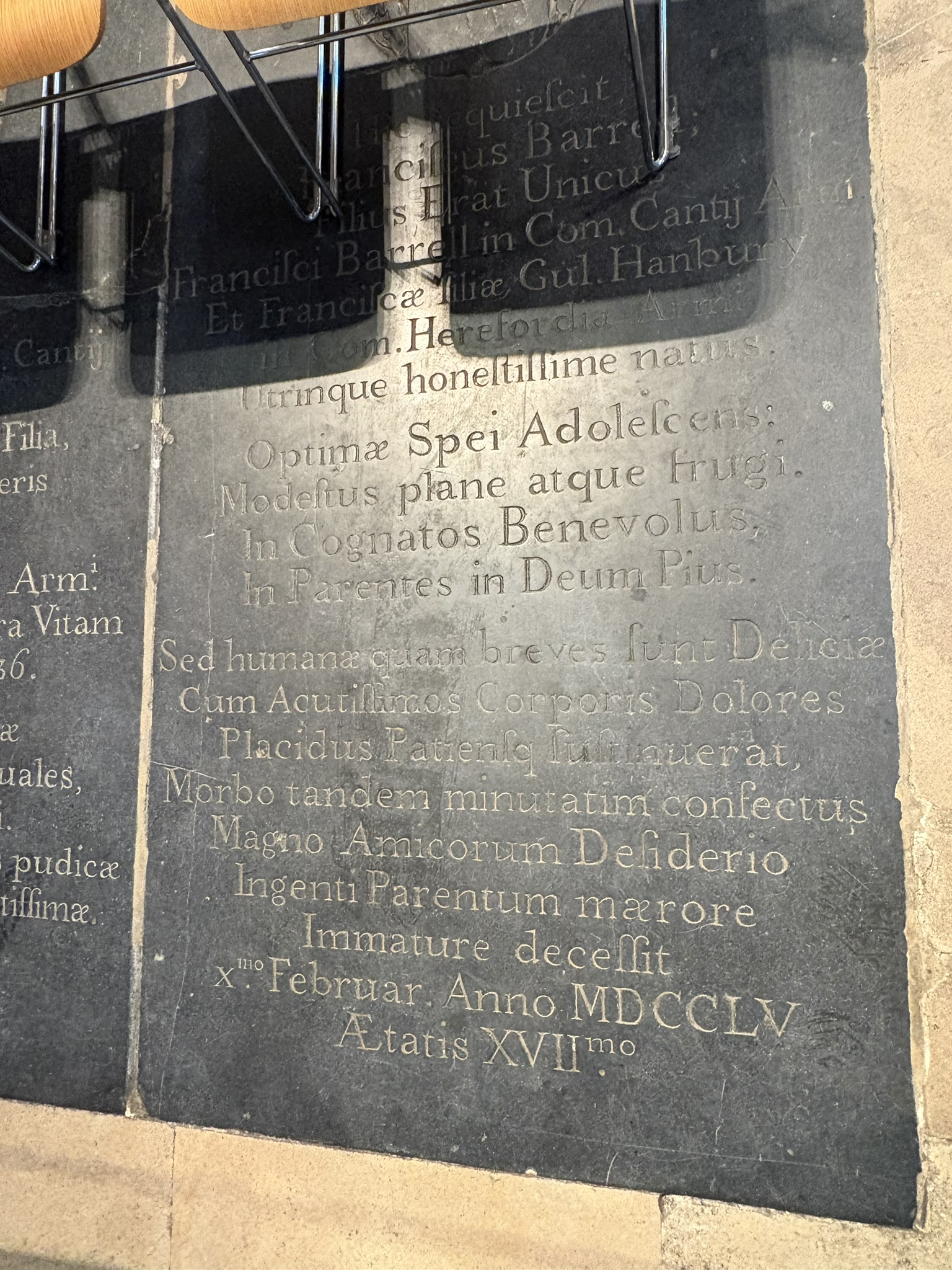 In Latin: Here rests Francis Barrell, the only son of Francis Barrell of the County of Kent, Esquire, and of Frances, daughter of William Hanbury, Esquire, of the County of Hereford; on both sides most honorably born. A youth of the highest promise; Plainly modest and frugal. Benevolent to his relatives; Devout toward his parents and toward God. But how brief are human delights. After he had borne the most acute pains of the body with serenity and patience, At length, gradually worn down by illness, To the great grief of his friends and the deep sorrow of his parents, he died before his time on the 10th of February, in the year 1755, in the 17th year of his age.