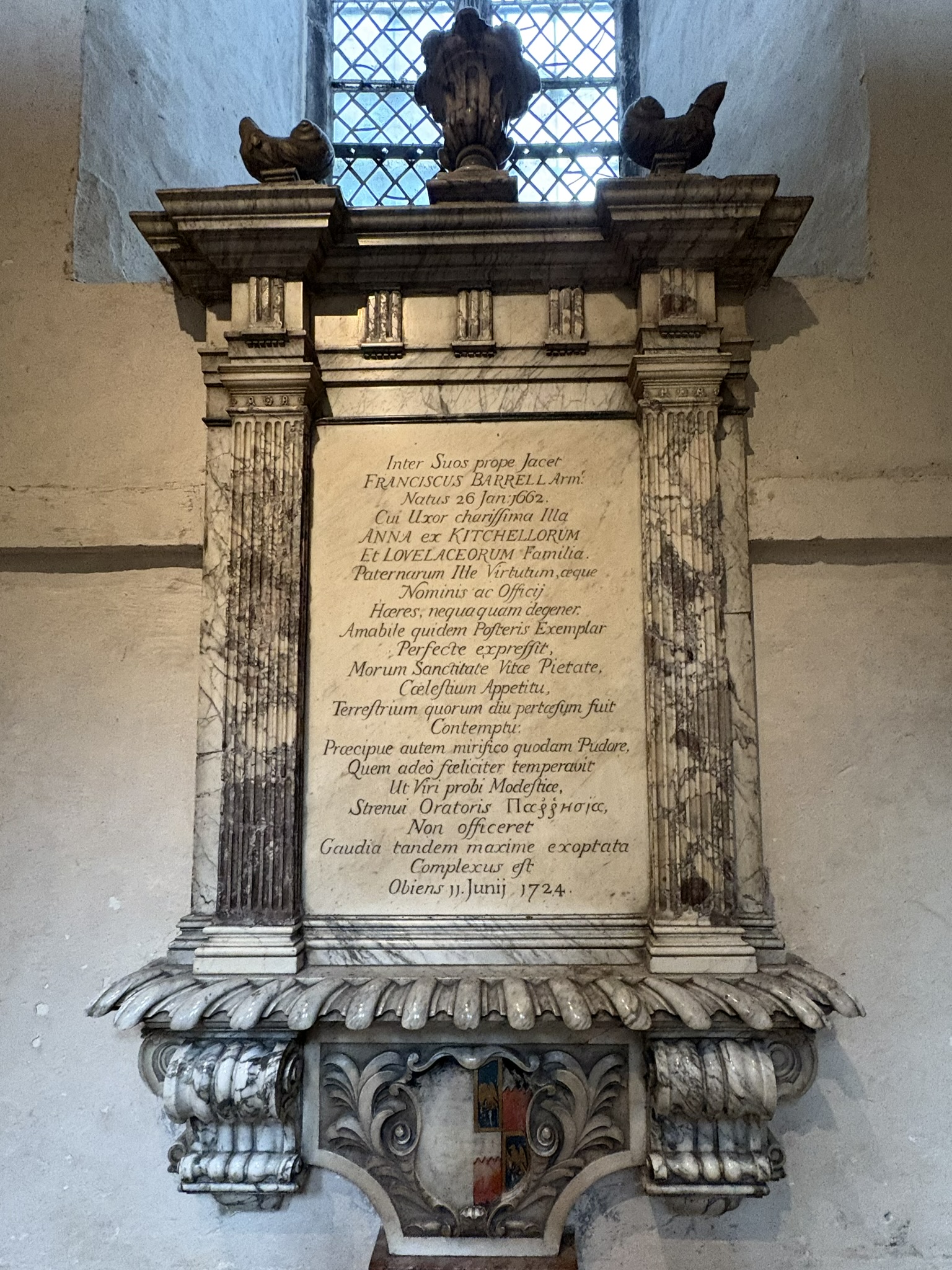 In Latin: Near his own people lies Francis Barrell, Esquire: Born 26 January 1662. His most beloved wife was Anna, of the families of the Kitchells and the Lovelaces. He, the heir of his father’s virtues as well as his name and office, was in no way unworthy of them. He perfectly displayed a truly amiable example for posterity, in the holiness of his conduct, the piety of his life, his yearning for heavenly things, and his contempt for earthly things, of which he had long grown weary. Above all, in a certain remarkable "pudor", which he so happily tempered that the modesty of a man of probity did not impede the [...] of a vigorous orator. At last he embraced the joys he had greatly longed for, dying on 11 June 1724.