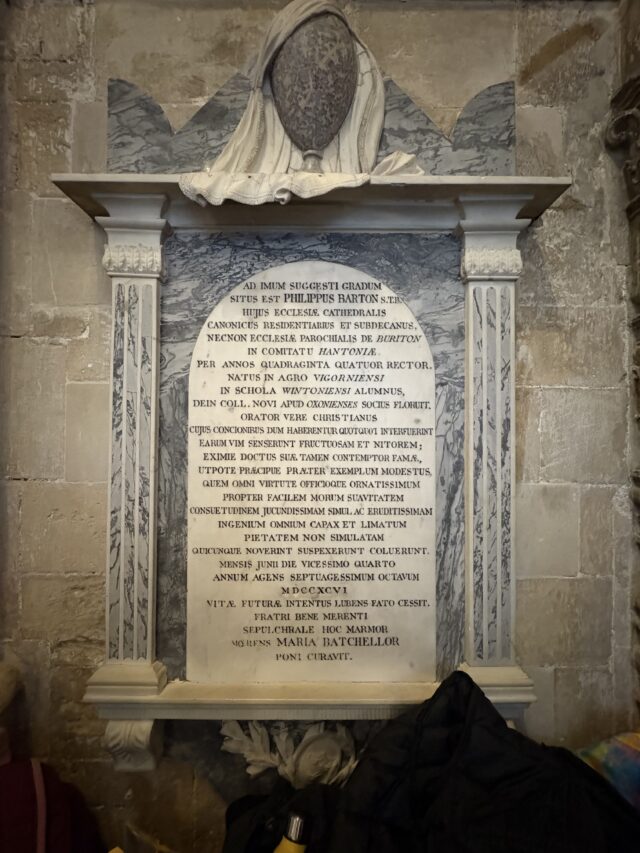 In Latin: Beneath the lowest step of the sanctuary lies Philip Barton, S.T.B. Canon Residentiary and Subdean of this Cathedral Church, and also Rector for forty-four years of the parish church of Buriton in the county of Hampshire. Born in the countryside of Worcestershire, educated at Winchester School, he later flourished as a Fellow of New College among the men of Oxford. A truly Christian preacher, whose sermons, whenever they were delivered, all who were present felt to be powerful, fruitful, and brilliant. Exceptionally learned, yet a despiser of his own fame, being modest beyond compare; a man adorned with every virtue and duty, whose sweet manners made his company most pleasant as well as deeply erudite; a mind capable of all things and finely polished; a piety not simulated. All who knew him admired and cherished him. On the twenty-fourth day of June, in the seventy-eighth year of his age, 1796, intent upon the life to come, he willingly yielded to fate. The mourning Maria Batchellor caused this  sepulchral marble to be placed for a meritorious brother