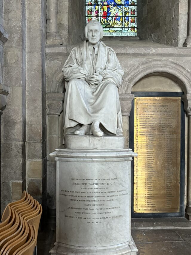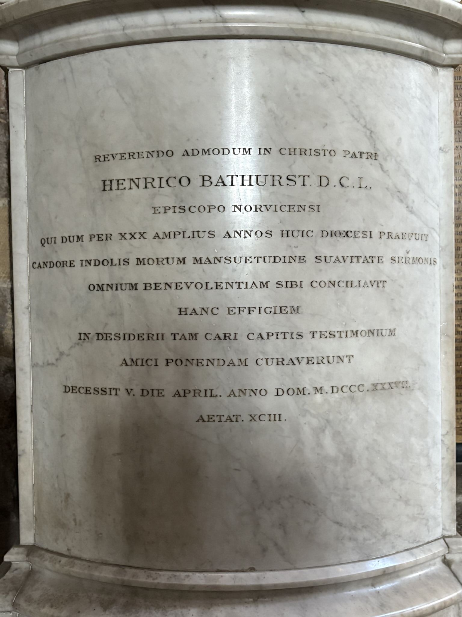 In Latin: To the most reverend father in Chris, Henry Bathurst D. C. L., Bishop of Norwich, who, while he presided over this diocese for more than thirty years, conciliated the goodwill of all by his candour of character, mildness of manners, and sweetness of speech. His friends took care to have this likeness set up as a testimony to the longing they feel for so dear a mentor. He died on the 5 day of April, in the Year of the Lord 1837, aged 92.