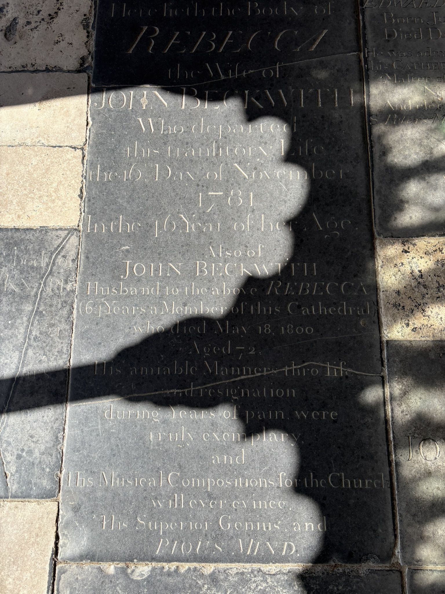 Beckwith, John Church: Norwich Cathedral (in Norwich, Norfolk).Relation: Spouse.Profession: Musician.Sex: Male.Virtue(s): Amiability*, Genius, Piety, Resignation, Superiority*.Language: Only English.Year of death: 1800.Age at death: 72 (classed as: Adult).Looks like JavaScript is disabled; enable to get an interactive map of UK grave monuments.