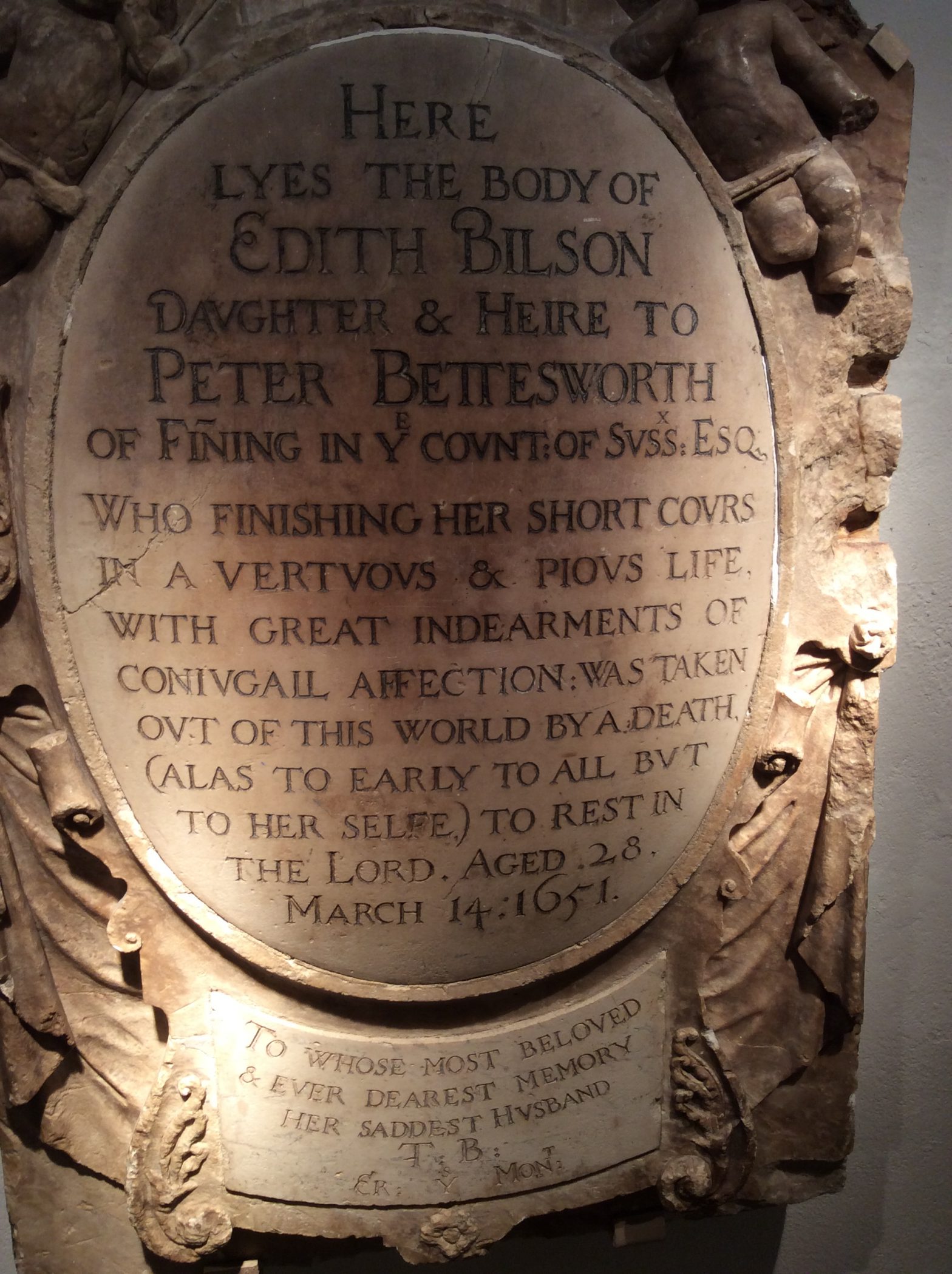 Bilson, Edith Church: St. Martin in the Fields (in Westminster, London).Relation: Child.Sex: Female.Virtue(s): Affection, Endearingness*, Good spouse, Piety, Virtue.Afterlife: Known.Language: Only English.Year of death: 1651.Age at death: 28 (classed as: Adult).Looks like JavaScript is disabled; enable to get an interactive map of UK grave monuments.