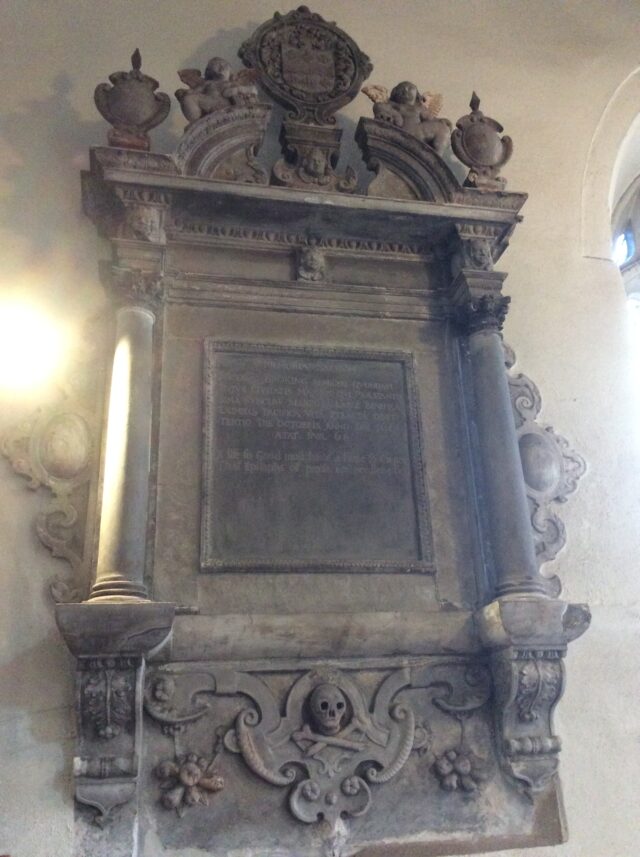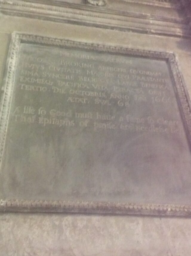 In Latin: To the sacred memory of Nicolai Broking, squire, once mayor of this city, who led a very sincere, religious, generous, beneficent, and exceptionally peaceful life. He died on the third day of October, 1666 AD, in the 68 year of his life.