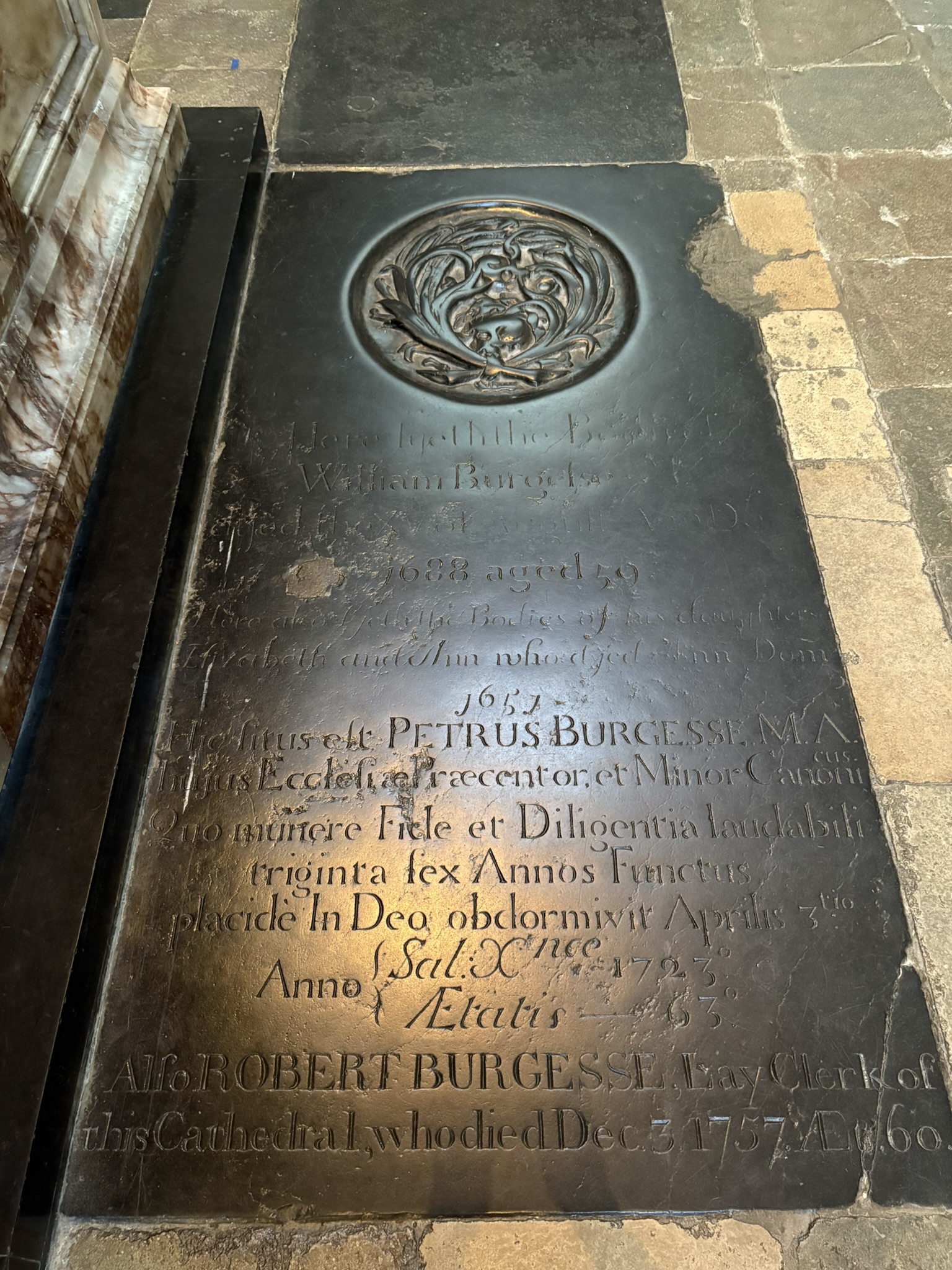 In Latin: Here lies Peter Burgesse M.A., precentor and minor canon of this church, in which office he served with commendable faith and diligence for thirty-six years. He fell peacefully asleep in the Lord on April 3, 1723 AD, in the 63rd year of his age.