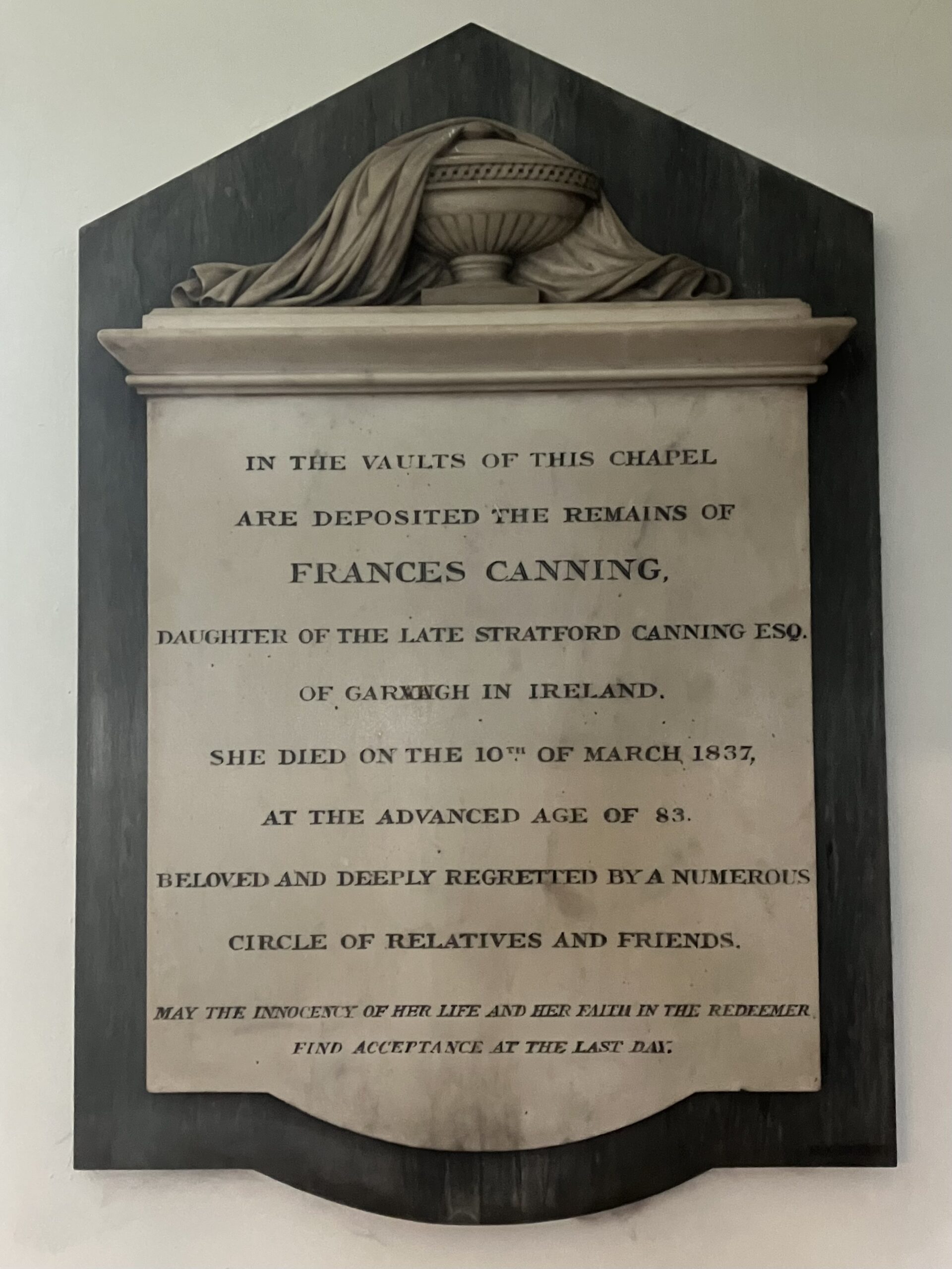 Canning, Frances Church: Grosvenor Chapel - Westminster (in Westminster, London).Relation: Child.Sex: Female.Virtue(s): Faith*, Innocence*.Afterlife: Looked for*.Language: Only English.Year of death: 1837.Age at death: 83 (classed as: Adult).Looks like JavaScript is disabled; enable to get an interactive map of UK grave monuments.