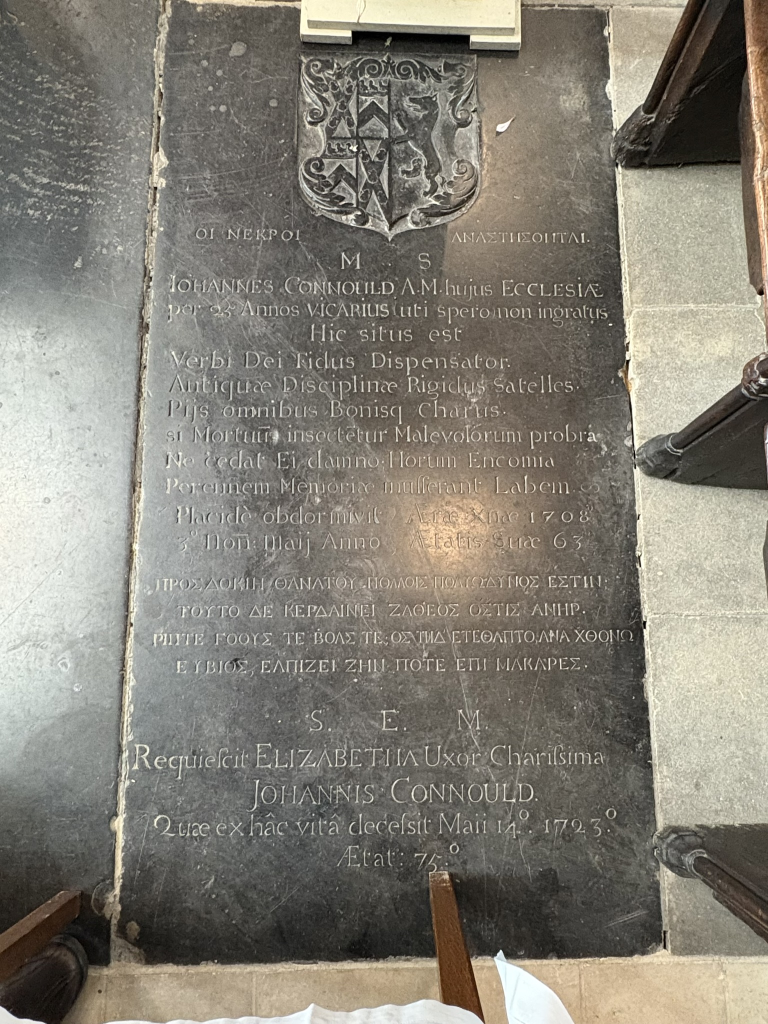 In Latin: John Connould, A.M., vicar of this church for 25 years is buried here, I hope not without gratitude — a faithful divider of the Word of God, a strict guardian of ancient discipline, dear to all the pious and good.