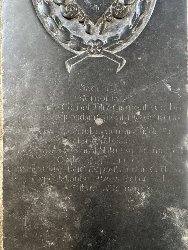 In Latin: Sacrum Memoriae Thomasinae Corbet Filiae Clementi Corbet L Doctoris & quondam Cancellarius [...] [...] Pia, Prudens, Benefica Fidelis Filiae [… dilectissimae] [...] Obiit […] Julii 1664 Cujus Exuviae Hic Depositae sunt in Certam Expectationem Resurrectionis ad Vitam Aeternam. In English: Sacred to the memory of Thomasina Corbet, daughter of Clement Corbet, Doctor of Laws and formerly Chancellor of […]. A pious, prudent, beneficent and faithful daughter, most beloved [...]. She died [...]July 1664, Whose mortal remains are laid here, in certain expectation of the Resurrection to eternal life.
