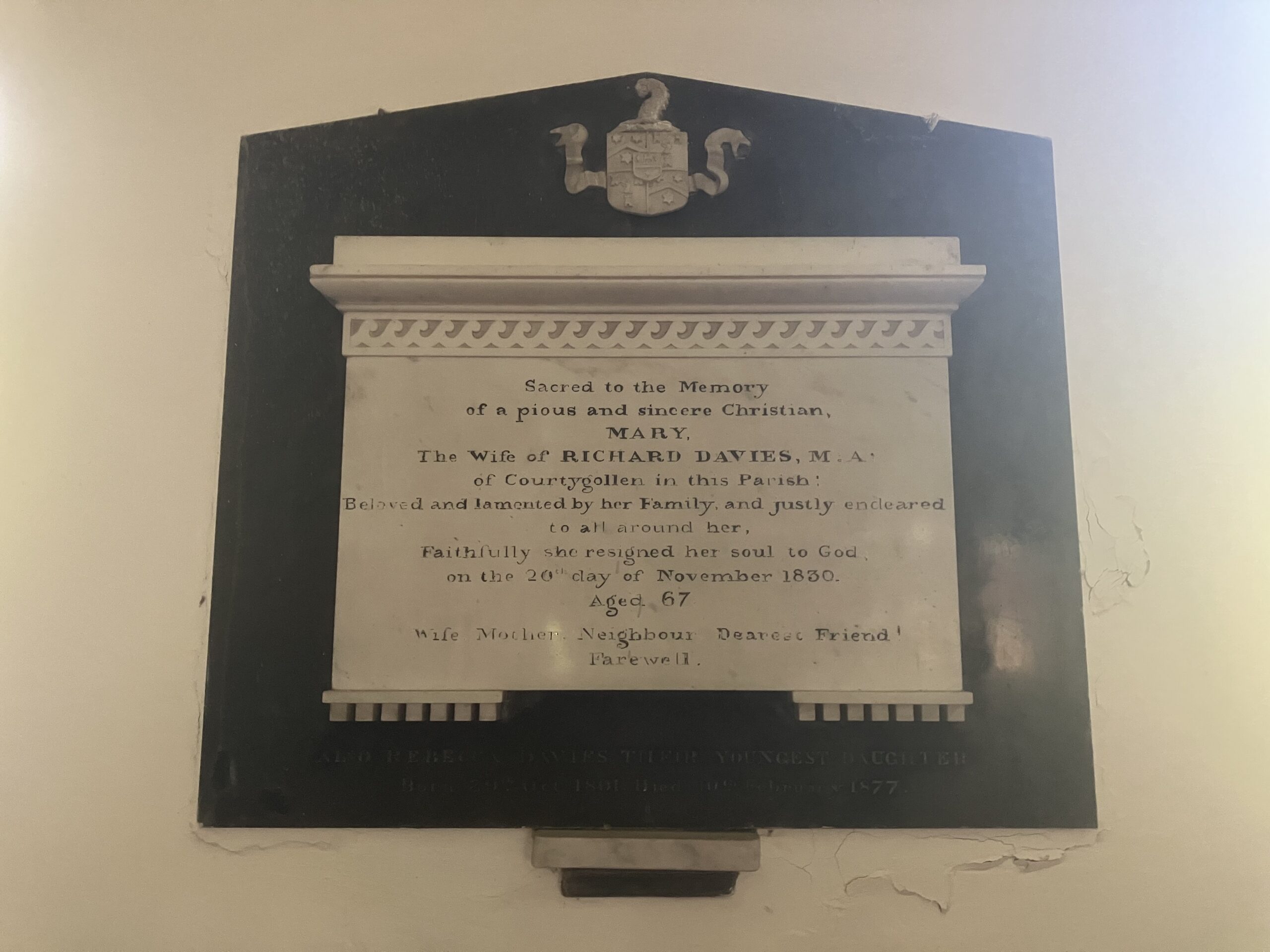 Davies, Mary Church: St. Cenau - Llangenny (in Llangenny, Wales).Relation: Spouse.Sex: Female.Virtue(s): Christianity/religion, Faith*, Piety, Sincerity.Language: Only English.Year of death: 1830.Age at death: 67 (classed as: Adult).Looks like JavaScript is disabled; enable to get an interactive map of UK grave monuments.