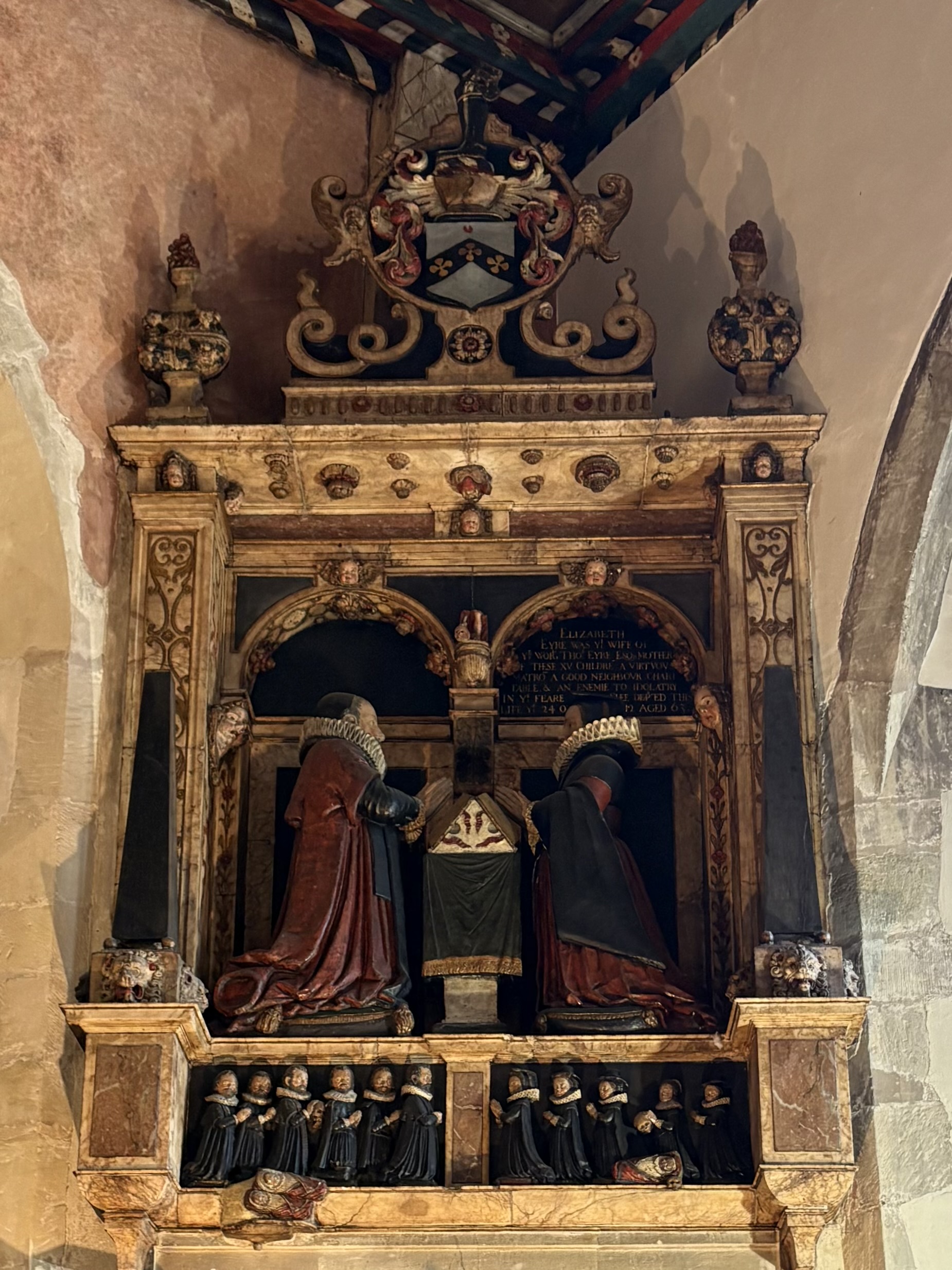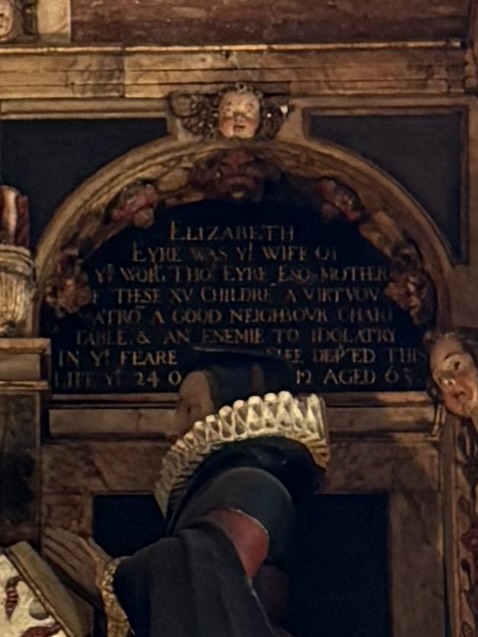 ELIZABETH EYRE WAS Y'e WIFE OF Y'e WOR'[thy] THO's EYRE, ESQ'r. MOTHER OF THESE XV CHILDREN A VIRTVOUS MATRO' A GOOD NEIGHBOUR CHARI-TABLE & AN ENEMIE TO IDOLATRY. IN Y'e FEARE OF GOD SHE DEP'ED THIS LIFE Y'e 24 OF DECEMB'r 1612 AGED 63