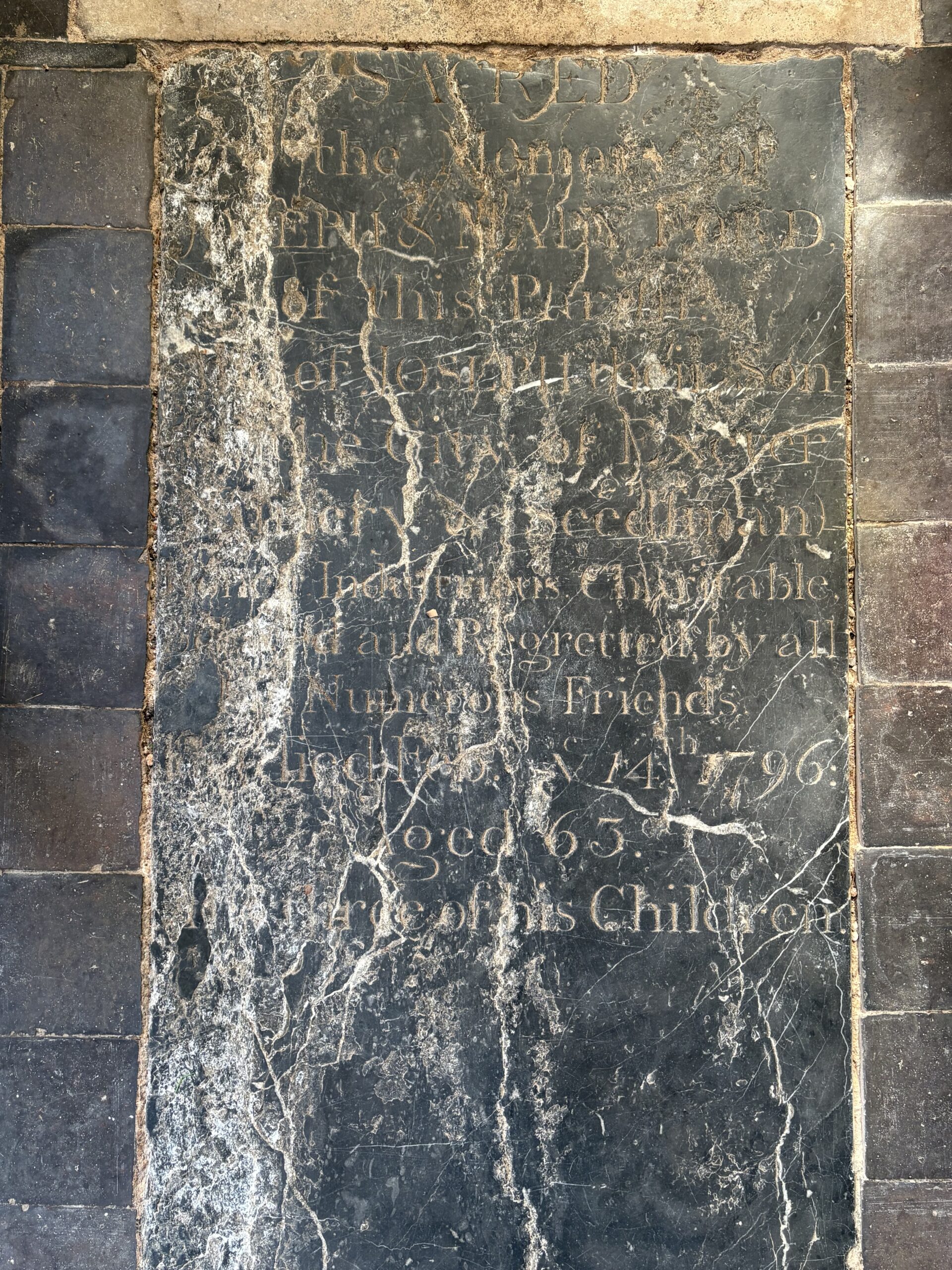 Sacred to the Memory of JOSEPH and MARY FORD of this Parish: Also of JOSEPH their Son [...] the City of Exeter. [...] Industrious, Charitable, [...] and regretted by all His Numerous Friends. He died Feb. ye 14th 1796, Aged 63. [...] of his children.