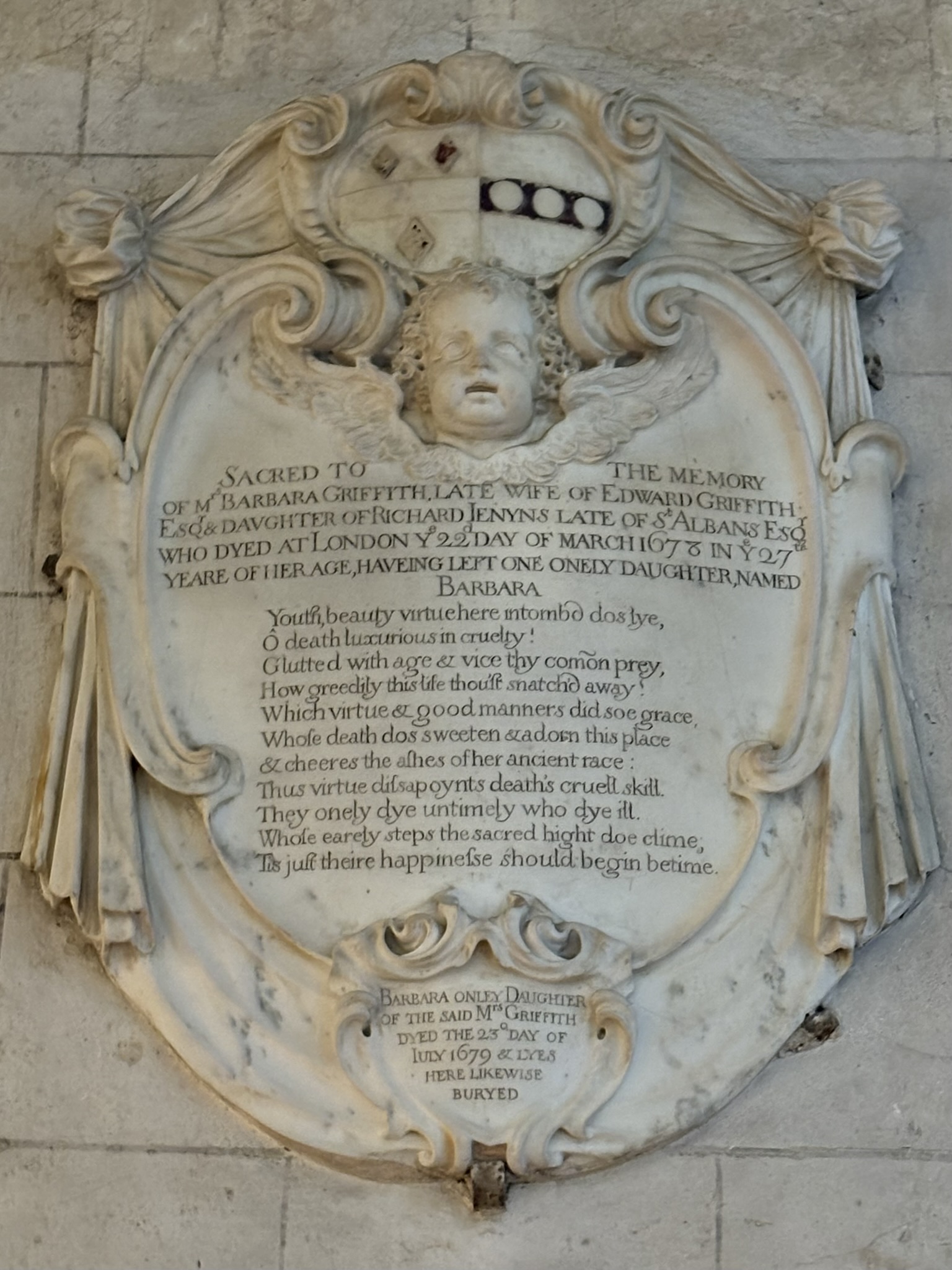 Griffith, Barbara Church: St. Albans Cathedral (in St Albans, Hertfordshire).Relation: Child, Spouse.Sex: Female.Virtue(s): Beauty*, Good manners, Rank*, Virtue.Afterlife: Known.Literature: Poetry*.Language: Only English.Year of death: 1678.Age at death: 27 (classed as: Adult).Looks like JavaScript is disabled; enable to get an interactive map of UK grave monuments.