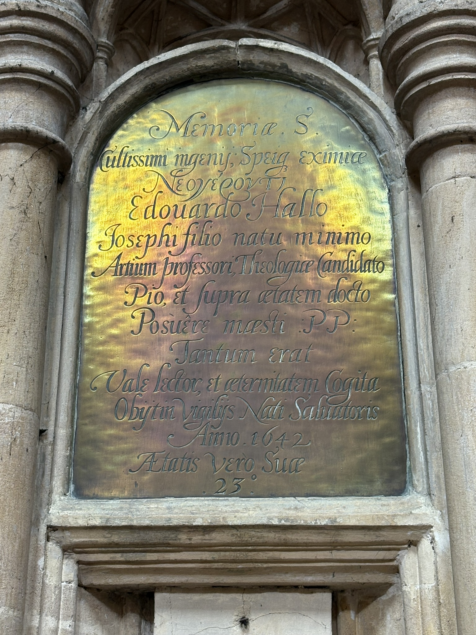 In Latin: Sacred to the memory of a man of most cultivated intellect and exceptional promise, the young-old [neogeronti] Edward Hall, Joseph's youngest son, graduate of the arts and candidate in theology, pious and learned beyond his years. This was placed by the impure P. P., and that is all. Farewell, reader, and think on eternity. He died during the watches of the Nativity, 1642, in the 23rd year of his age.