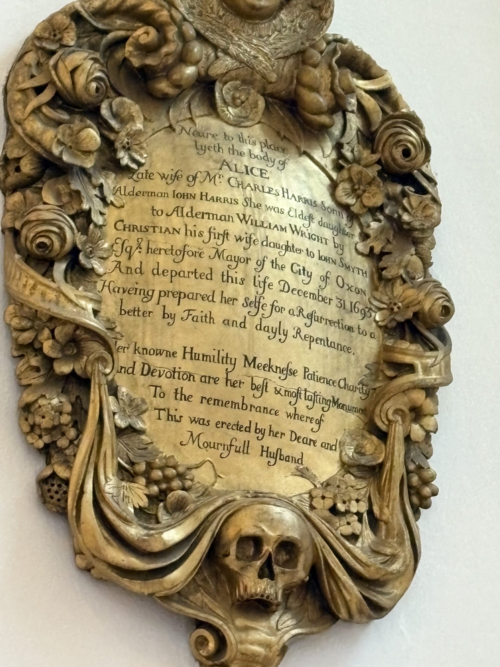 Neare to this place lyeth the body of Alice, the wife of Mr Charles Harris son of Alderman John Harris. She was eldest daughter to Alderman William Wright by Christian his first wife daughter to John Smith Esq. heretofore Mayor of the City of Oxon, and departed this life December 31 1693 haveing prepared her selfe for a Resurrection to a better by Faith and dayly Repentance. Her knowne Humility, Meeknesse, Patience, Charity and Devotion are her best & most lasting Monument. To the remembrance whereof this was erected by her Deare and Mournfull husband.