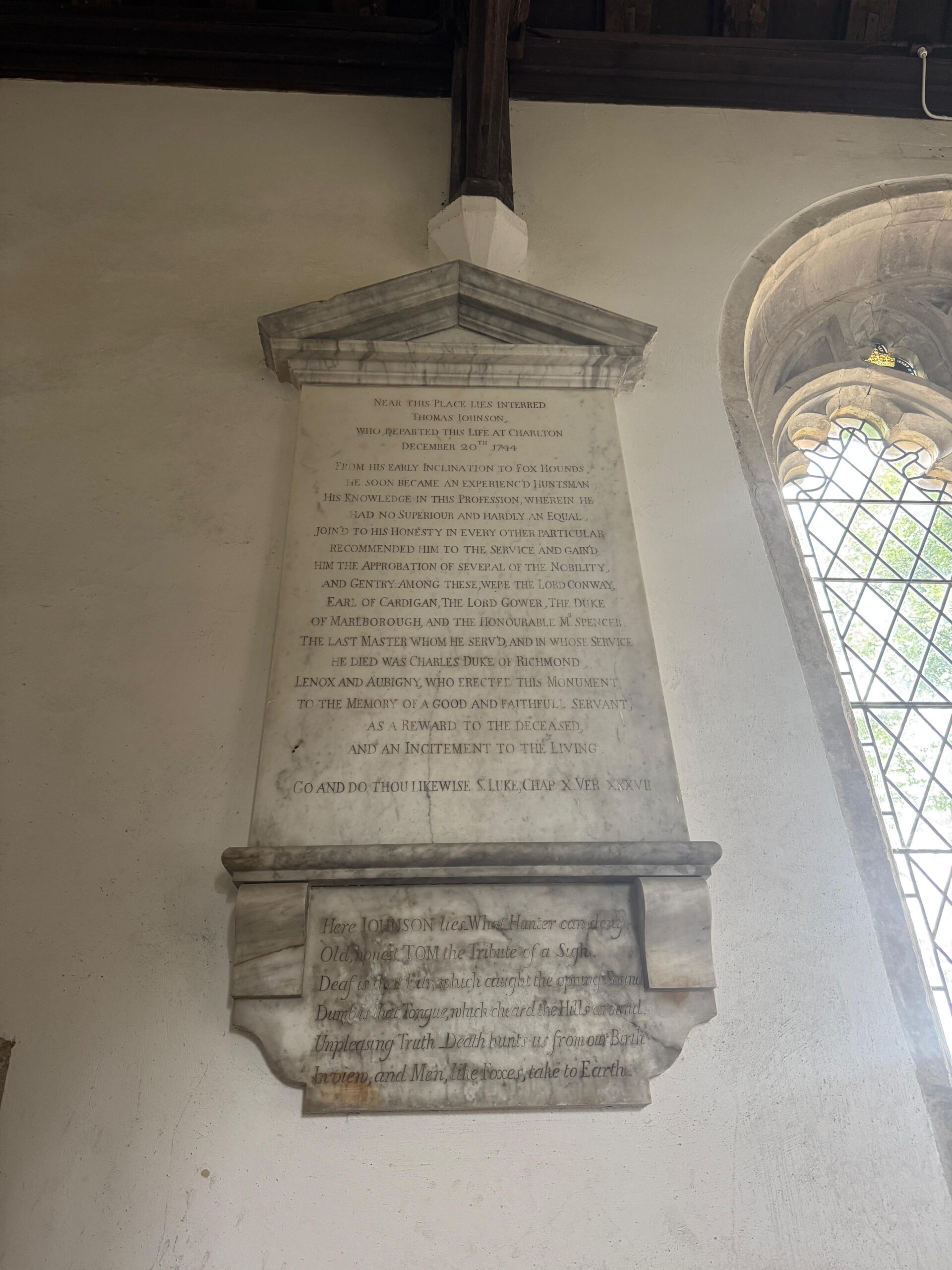 Johnson, Thomas Church: The Blessed Virgin Mary - Singleton (in Singleton, West Sussex).Profession: Servant.Sex: Male.Virtue(s): Approved*, Distinction*, Experience, Fidelity*, Goodness, Honesty, Superiority*.Exemplar: Exemplar of the Virtues, Reminder of death*.Literature: Biblical citation, Play on profession, Poetry*.Language: Only English.Year of death: 1744.Age at death: not given (classed as: Adult).Looks like JavaScript is disabled; enable to get an interactive map of UK grave monuments.