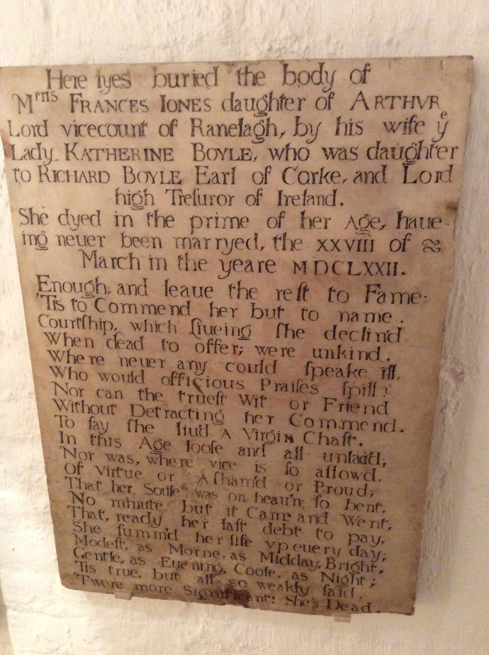 Jones, Frances Church: St. Martin in the Fields (in Westminster, London).Relation: Child.Sex: Female.Virtue(s): Chastity*, Faith*, Famed*, Gentleness, Humility*, Modesty*, Virginity, Virtue.Literature: Poetry*.Language: Only English.Year of death: 1672.Age at death: not given (classed as: Adult).Looks like JavaScript is disabled; enable to get an interactive map of UK grave monuments.