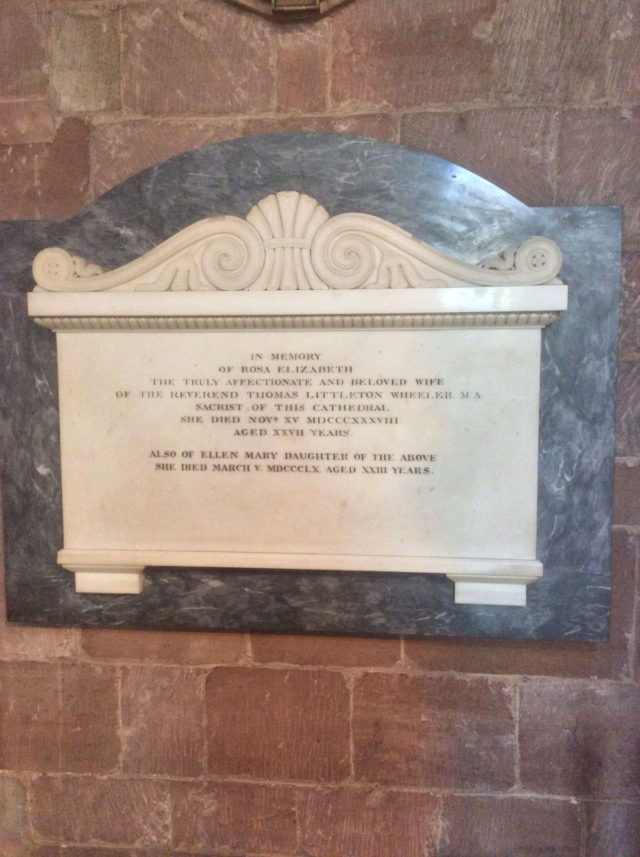 Wheeler, Rosa Church: Worcester Cathedral (in Worcester, Worcestershire).Relation: Spouse.Sex: Female.Virtue(s): Affection, Good spouse.Language: Only English.Year of death: 1838.Age at death: 27 (classed as: Adult).Looks like JavaScript is disabled; enable to get an interactive map of UK grave monuments.