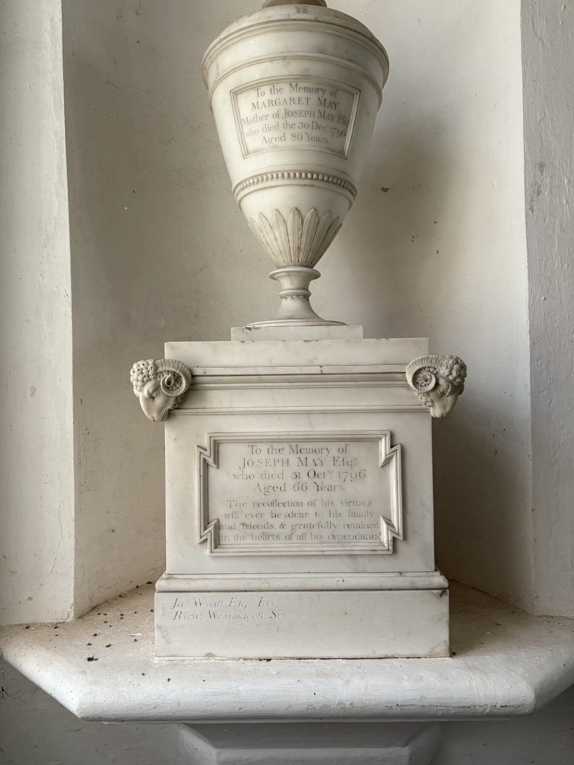 May, Joseph Church: St. Mary's - Hale (in Hale, Hampshire).Sex: Male.Virtue(s): Virtues in general*.Language: Only English.Year of death: 1796.Age at death: 66 (classed as: Adult).Looks like JavaScript is disabled; enable to get an interactive map of UK grave monuments.