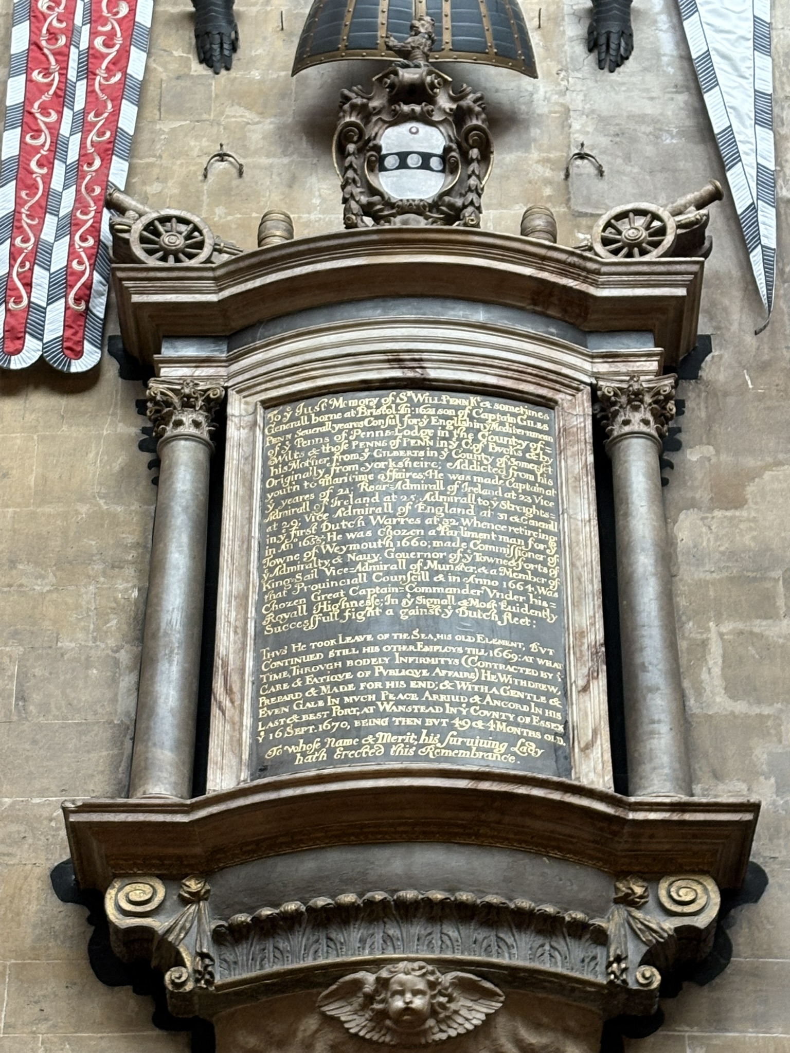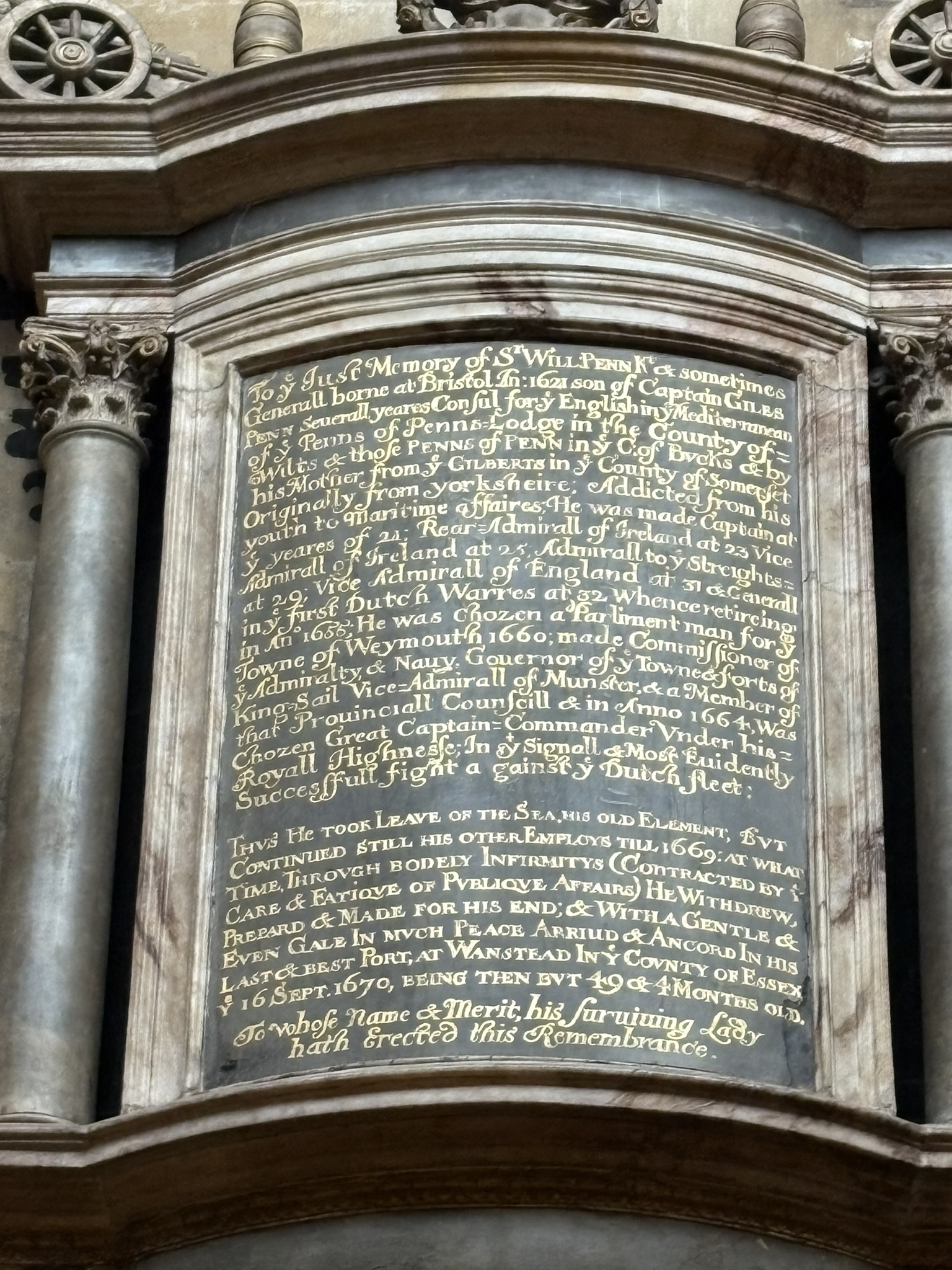 To Ye Just Memory of Sr. William Penn, Kt & Sometimes Generall; borne at Bristol In 1621 son of Captain Giles. Penn severall years consul for ye English in ye Mediterranean of the Penns of Penn Lodge in the County of Wilts & those Penns of Penn in ye County of Bucks & by his Mother from ye Gilberts in ye County of Somerset, Originally of Yorkshire. Addicted from his youth to maritime affairs he was made Captain at ye years of 21. Rear-Admirall of Ireland at 23, Vice Admirall of Ireland at 24. Admirall to ye. Straightes at 29. Vice Admirall of England at 31 a Generall in ye First Dutch Warres at 32 whence retiring in Ano.1665. He was chosen a Parliament man for ye Towne of Weymouth 1660 made Commissioner of ye Admiralty & Navy Govoner of ye Towns and Ports of King Sail Vice Admirall of Munster & a member of that Provinciall Councell and in Ano. 1664, Was Chozen Great Captain Commander Under his Royall Highness: In ye signall & most Evidently Successful fight against the Dutch Fleet. Thus he took his Leave of the Sea his old element, But Continued still His other Employs till 1669: at which Time: Through Bodily Infirmitys. (Contracted by ye Care & Fatigue of Public Affairs) He Withdrew Prepared & Made for his end, & with a Gentle & Even Gale in much peace arrived & anchored in his Last and Best Port, at Wanstead In ye County of Essex ye 16 Sept 1670 being then but 49 & 4 months old To whose Name and Merit his surviving Lady Hath Erected this Remembrance