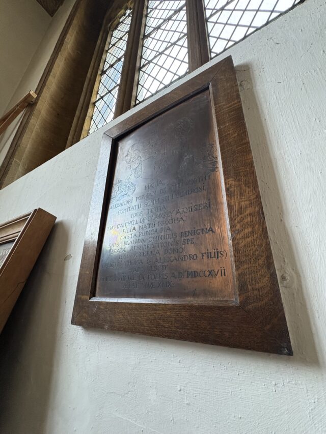 In Latin: "Maria, third wife of Alexander Popham of Huntworth, a gentleman of the county of Somerset, and the eldest daughter of Thomas Gatchell of Clawsey, knight, chaste, modest, pious, gentle to her own, benign to all, in the hope of a blessed resurrection rests in this eternal home, leaving behind sons Thomas and Alexander. She died 18 October, 1717 AD, in the 49th year of her age."