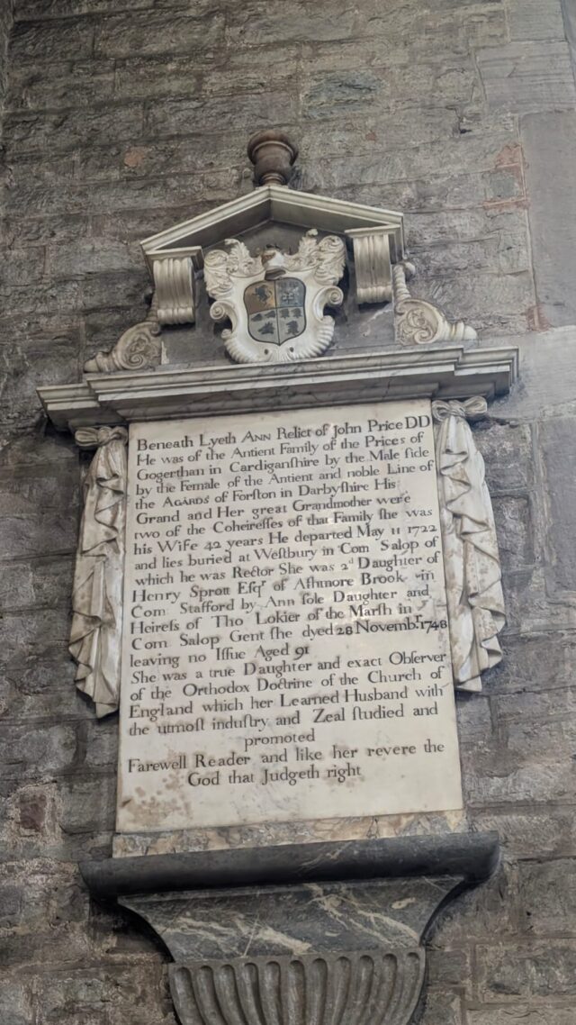 Price, Ann Church: St. Laurence's - Ludlow (in Ludlow, Shropshire).Relation: Child, Grandchild, Great-grandchild, Spouse.Sex: Female.Virtue(s): Orthodoxy*, Rank*, Reverence.Exemplar: Exemplar of the Virtues.Language: Only English.Year of death: 1748.Age at death: 91 (classed as: Adult).Looks like JavaScript is disabled; enable to get an interactive map of UK grave monuments.