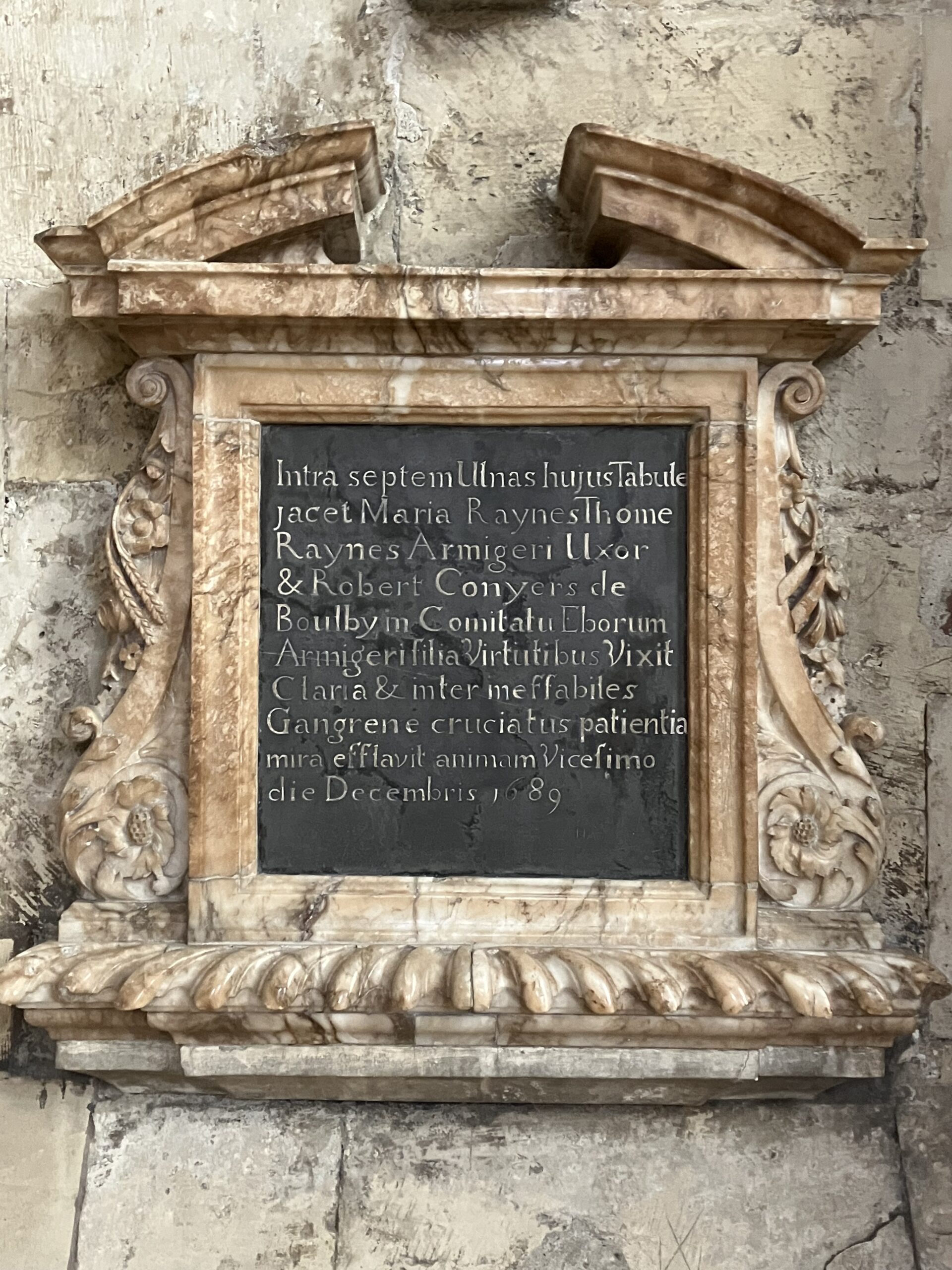 In Latin: Within seven ells of this monument lies Mary Raynes, wife of Thomas Raynes Esq., and daughter of Robert Conyers Esq., of Boulby, Yorkshire. She lived distinguished by her virtues and expired amidst the unspeakable tortures of gangrene, which she endured with astonishing patience, on the 20th December 1689. [Translation courtesy of York Minster records.]