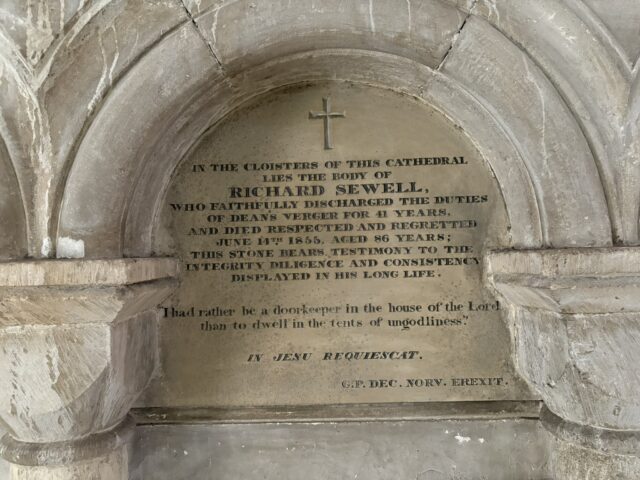 Sewell, Richard Church: Norwich Cathedral (in Norwich, Norfolk).Profession: Sexton/verger.Sex: Male.Virtue(s): Constancy*, Diligence, Duties of office, Fidelity*, Integrity, Respected*.Literature: Biblical citation.Language: Only English.Year of death: 1855.Age at death: 86 (classed as: Adult).Looks like JavaScript is disabled; enable to get an interactive map of UK grave monuments.