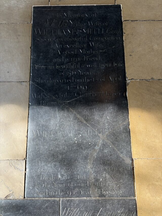 In Memory of MARY, the Wife of WILLIAM SMITH Gent. She was a chearful Companion, An excellent Wife, A good Mother, and a true Friend. After a Healthful and well spent Life of 86 Years, She departed on the 18 April 1769, With a joyful Christian hope in the Bounty of her gracious Creator and Redeemer.