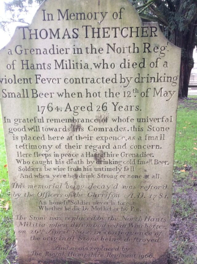 Thetcher, Thomas Church: Winchester Cathedral (in Winchester, Hampshire).Profession: Grenadier.Sex: Male.Virtue(s): Benevolence*, Honesty.Literature: Humour, Poetry*.Language: Only English.Year of death: 1764.Year of headstone: 1781.Age at death: 26 (classed as: Adult).Looks like JavaScript is disabled; enable to get an interactive map of UK grave monuments.