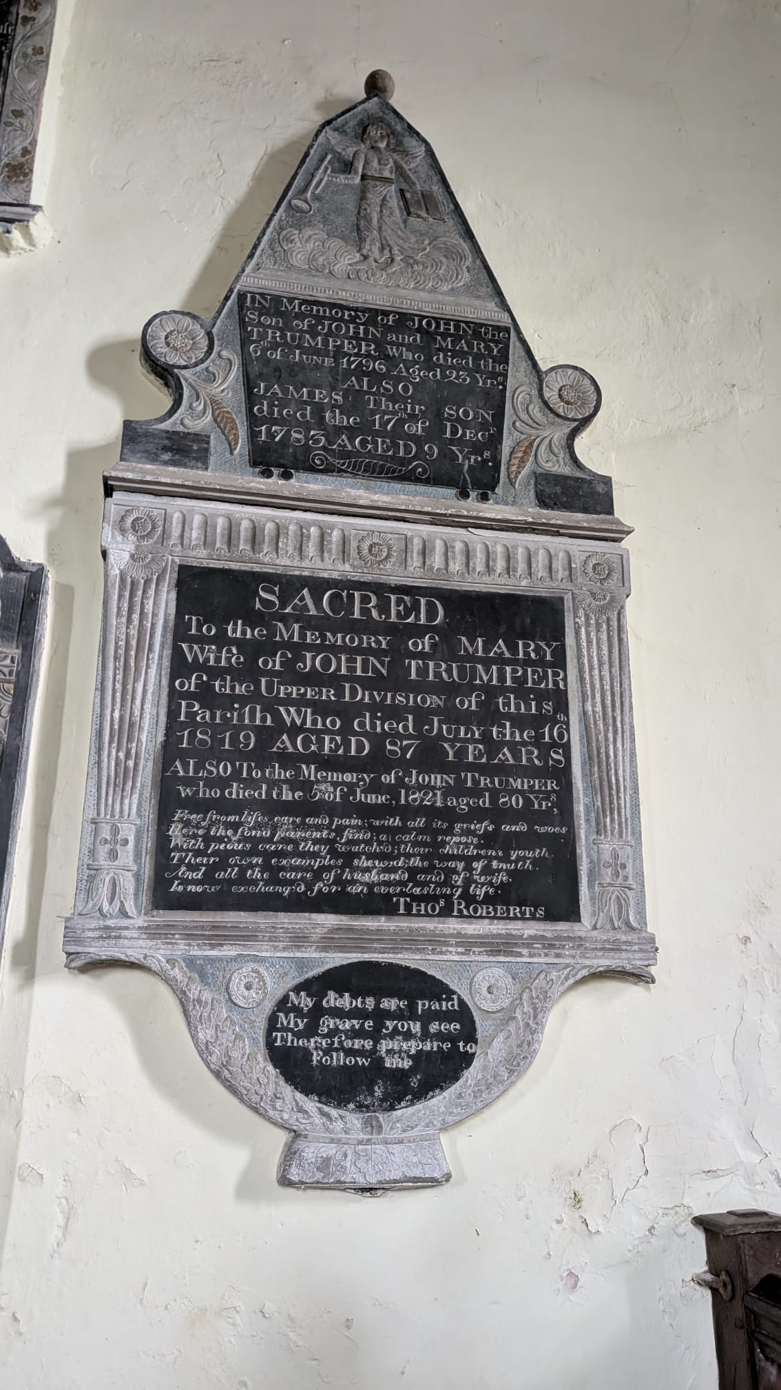 Trumper, John Church: St. David's - Llanthony (in Llanthony, Wales).Relation: Parent, Spouse.Sex: Male.Virtue(s): Care*, Fondness, Good parent, Piety.Exemplar: Exemplar of the Virtues, Reminder of death*.Afterlife: Known.Literature: Poetry*.Language: Only English.Year of death: 1821.Age at death: 80 (classed as: Adult).Looks like JavaScript is disabled; enable to get an interactive map of UK grave monuments.