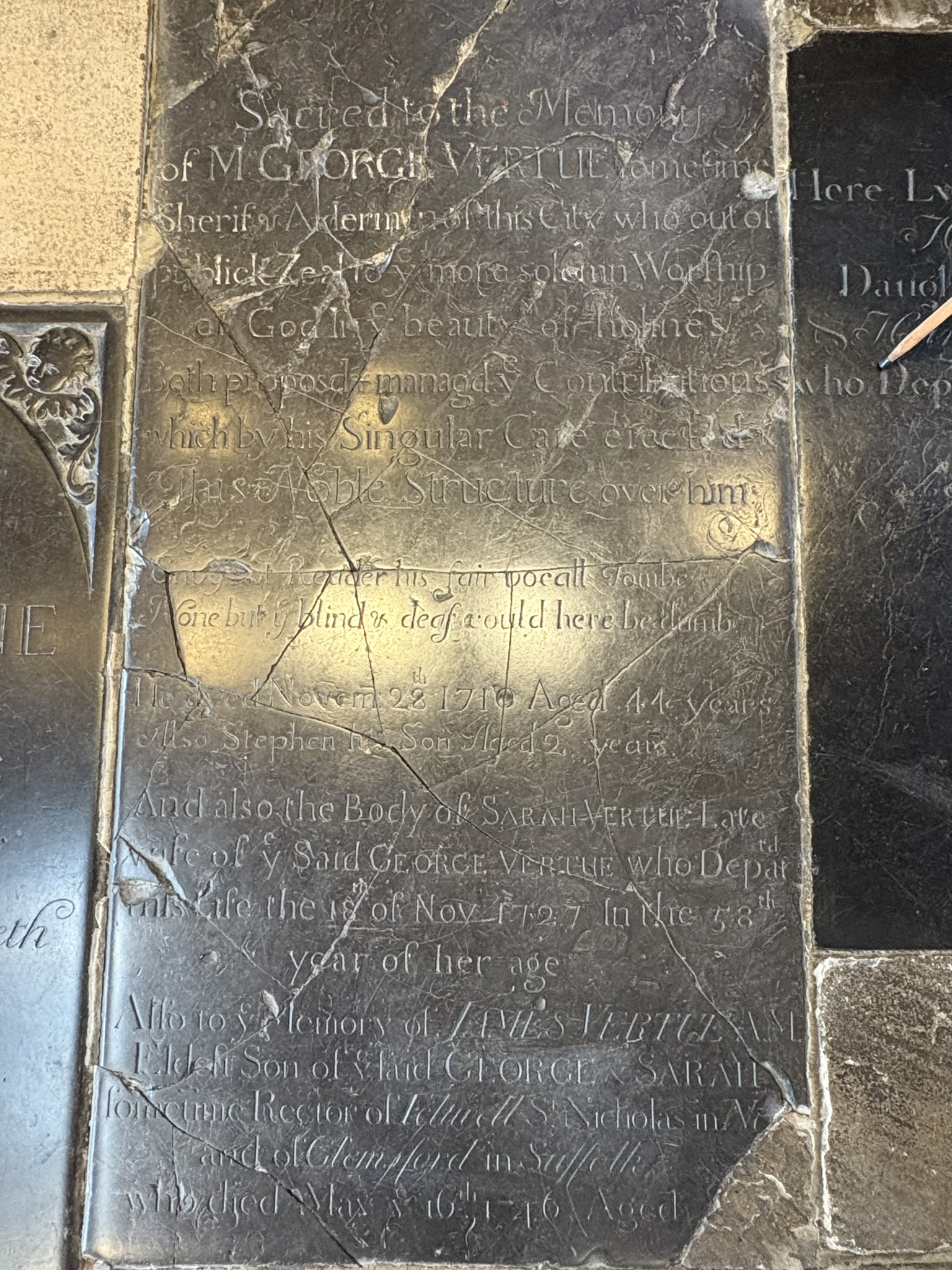 Vertue, George Church: St. Peter Mancroft - Norwich (in Norwich, Norfolk).Profession: Alderman*, Magistrate*.Sex: Male.Virtue(s): Benefactor to church, Care*, Love of/service to church, Zealousness*.Literature: Poetry*.Language: Only English.Year of death: 1710.Age at death: 44 (classed as: Adult).Looks like JavaScript is disabled; enable to get an interactive map of UK grave monuments.
