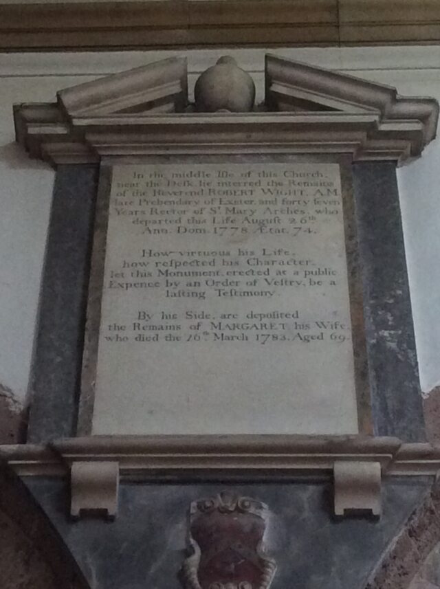 Wight, Robert Church: St. Mary Arches - Exeter (in Exeter, Devon).Profession: Prebendary, Rector.Sex: Male.Virtue(s): Respected*, Virtue.Language: Only English.Year of death: 1778.Age at death: 74 (classed as: Adult).Looks like JavaScript is disabled; enable to get an interactive map of UK grave monuments.
